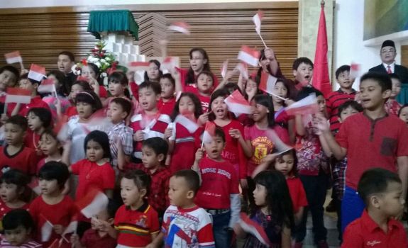 Inilah keceriaan anak-anak Sekolah Minggu Gereja HKBP (Huria Kristen Batak Protestan) Tebet, Jakarta Selatan, saat merayakan Hari Proklamasi Indonesia di gereja mereka, di kawasan Tebet Barat (Minggu,17/8). Di HUT ke-69 Republik Indonesia ini, HKBP Tebet melanjutkan tradisi ibadah syukur hari proklamasi.