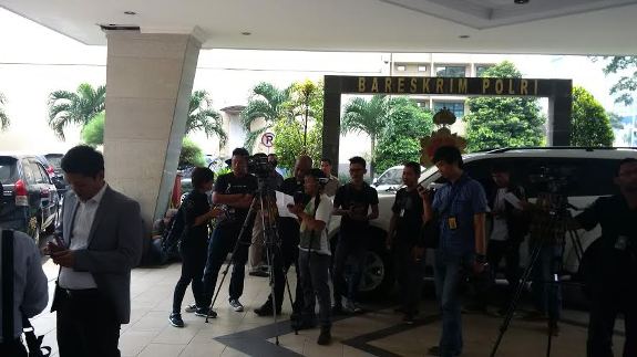Koordinator Tim Pembela Merah Putih, Habiburokhman (berjas paling kiri), mendatangi Badan Reskrim Mabes Polri untuk memenuhi panggilan polisi dalam kasus penggunaan logo garuda merah oleh pasangan Prabowo Subianto-Hatta Rajasa untuk Pilpres 2014.