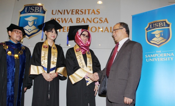 Kepala Badan Penelitian dan Pengembangan Kemendikbud Prof. Dr. Furqon (kanan) dan Rektor Universitas Siswa Bangsa Internasional (USBI) Prof Aman Wirakartakusumah (kiri) berbincang dengan sejumlah sarjana kelulusan bisnis Universitas Siswa Bangsa Internasional di Jakarta, Rabu (28/8). Berdasarkan data Organization for Economic Co-operation Development (OECD) pada 2012, Indonesia diprediksi menjadi negara dengan jumlah sarjana terbanyak kelima di dunia pada tahun 2020. WAHYU DWI NUGROHO/RM