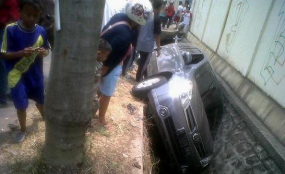Kecelakaan tunggal terjadi di kawasan Industri, Jatake, Tangerang, Minggu siang (7/9). Mobil Nissan B 7246 NXN nyunsep masuk got. Belum diketahui kronologi kejadian maupun korban jiwa. Tampak warga berkerumun penasaran ingin melihat langsung kondisi mobil nahas tersebut. TMC POLDA METRO JAYA.