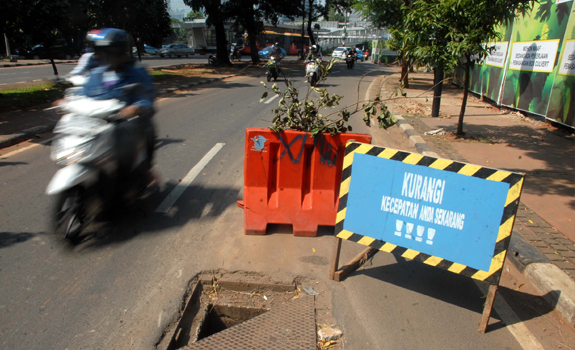 Sejumlah pengendara motor melintasi jalan berlubang di sekitar Jalan Sudirman Jakarta, Sabtu (27/9). Kendati telah diberikan tanda, namun jalan berlubang tersebut dapat mebahayakan pengguna jalan yang melintas. Selain itu, jalan berlubang juga kerap membuat lalu-lintas tersendat karena pengedara motor harus mengurangi laju kendaraan. PUTU WAHYU RAMA/RM