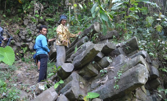 Jurukunci Situs Gunung Padang Majenang, Suganda Sasmita menunjukkan struktur batuan yang diduga sebagai peninggalan budaya megalitikum. Situs ini berada di Majenang Kabupaten Cilacap, Jawa Tengah. MUHAMAD RIDLO SUSANTO/RMOL
