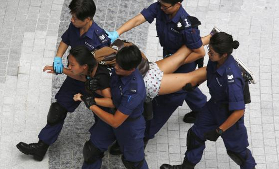Seorang pengunjuk rasa pro-demokrasi diboyong oleh polisi wanita setelah melempari gedung pusat pemerintahan di Hong Kong di tengah aksinya akhir pekan lalu. Gelombang unjuk rasa yang kembali muncul di Hong Kong digerakkan oleh para mahasiswa yang menilai pengaruh Tiongkok semakin kuat dalam pemerintahan Hong Kong. Hal itu merujuk pada keputusan Tiongkok yang menyebut bahwa hanya kandidat yang telah diperiksa oleh Beijing yang bisa mengikuti pemilihan umum kota untuk memperebutkan kursi kepala eksekutif yang merupakan posisi tertinggi sipil di Hong Kong. Unjuk rasa kemarin diwarnai dengan kekerasan dan menyisakan 38 orang luka-luka. REUTERS