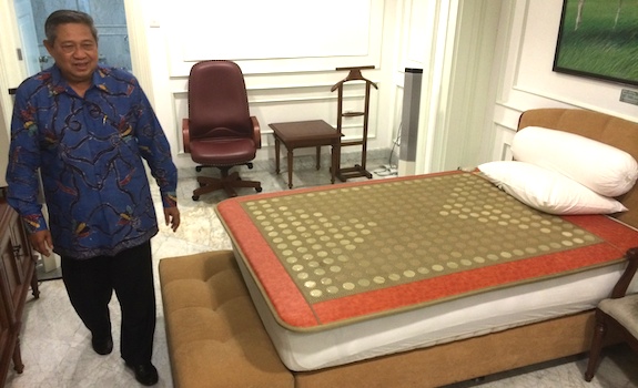 Presiden SBY memperlihatkan kamar tidur di dalam ruang kerjanya di Istana Negara kepada tim peneliti Gunung Padang usai pertemuan Sabtu malam (4/10). Di bagian dalam kamar tidur adalah kamar mandi dan toilet yang biasa digunakan Presiden SBY saat berada di Istana Negara. Kamar tidur ini bersebelahan dengan ruang makan yang juga tidak terlalu luas. TEGUH SANTOSA/RMOL