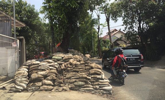 Pengendara sepeda motor dan mobil melintasi karung-karung berisi lumpur yang dikeruk dari parit di sepanjang Jalan Raya Pondok Kopi dan masih dibiarkan menumpuk. Karung-karung berisi lumpur yang dibiarkan lebih dari satu minggu itu sudah mulai mengganggu arus lalu lintas, selain mengeluarkan bau yang tidak mengenakan. Sudah saatnya pemerintah Jakarta mengangkat tumpukan karung yang menyerupai benteng itu.