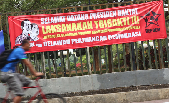 Seorang pengendara sepeda melintas di depan spanduk yang berisi ucapan selamat kepada Presiden dan Wakil Presiden terpilih Joko Widodo-Jusuf Kalla yang menghiasi pagar belakang Gedung Parlemen, Jakarta, Sabtu (18/10). Jokowi-JK diketahui akan dilantik pada 20 Oktober 2014 besok, dan kepada rakyat menaruh harapan karena dianggap dapat membawa perububahan. TEDY KROEN/RM