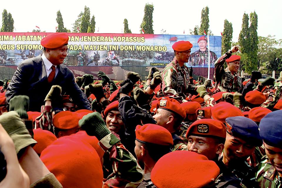 Mantan Komandan Kopassus Letnan Jenderal (Purn) Prabowo Subianto menghadiri acara serah terima jabatan Danjen Kopassus di Markas Kopassus, Cijantung, Jakarta Timur, Jumat pagi (24/10). Upacara serah terima jabatan dari Mayjen TNI Agus Sutomo ke Mayjen TNI Doni Monardo dipimpin oleh Kepala Staf TNI Angkatan Darat (KSAD) Jenderal TNI Gatot Nurmantyo.