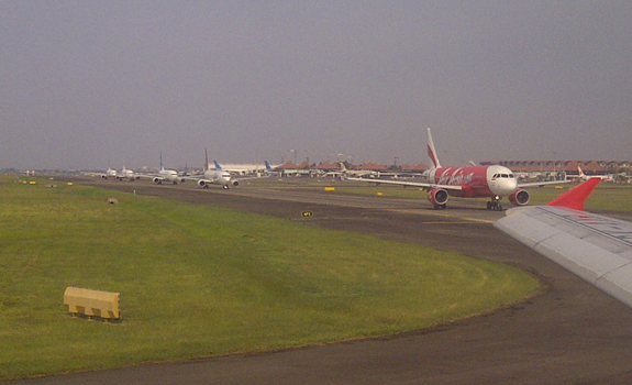 Sejumlah pesawat dari berbagai maskapai penerbangan terpaksa mengantri untuk mendapat giliran lepas landas dari Bandara Soekarno Hatta Cengkareng pada Jumat sore (24/10). Antrian pesawat terjadi disebabkan padatnya lalu lintas penerbangan di Bandara Soekarno Hatta. DAR EDI YOGA/RMOL
