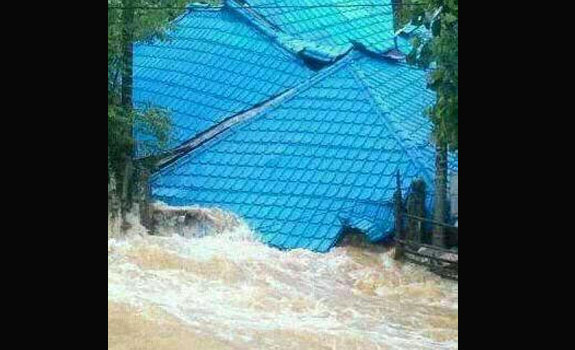 Salah satu Kampong di Kecamatan Lhoong, Aceh Besar terendam banjir pada Minggu (2/11). Banjir disebabkan oleh hujan deras yang turun dalam tiga hari terakhir ini. Selain merendam pemukiman, banjir juga menyebabkan jalan lintas Banda Aceh-Calang terputus karena amblasnya badan jalan dan terjadinya tanah longsor di belasan titik di Pegunungan Paro dan Kulu, Kecamatan Lhoong, Aceh Besar. Foto ini dikirim oleh seorang warga di lokasi bernama Doni Antara.