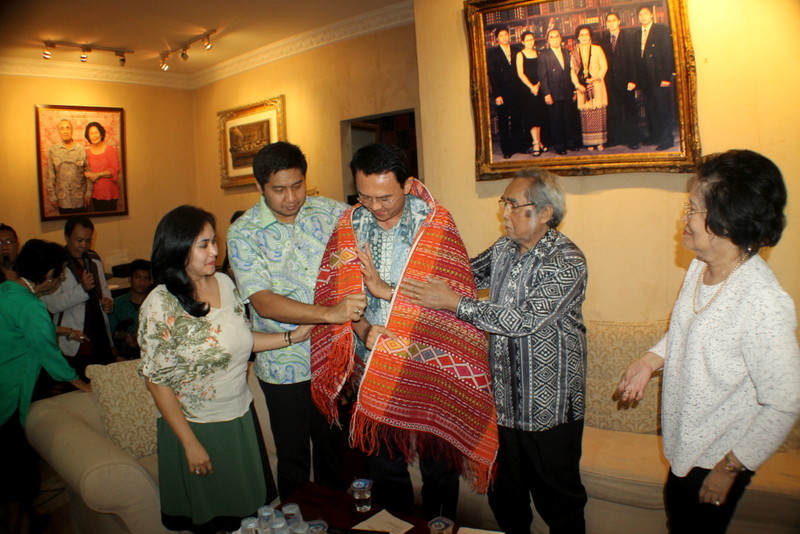 Ulos diberikan kepada Ahok di sela-sela acara syukuran yang diselenggarakan Keluarga Sabam Sirait atas kepulihannya dari perawatan medis selama lebih dari sebulan di RS Gleneagles, Singapura. Acara diadakan di kediaman di Kawasan Bintaro, Tanah Kusir, Jakarta Selatan, Sabtu (22/11). saat memberi ulos, Sabam ditemani Istri Sondang Boru Sidabutar, serta Putra Sulung Maruarar Sirait beserta istri Shinta Triastuti.