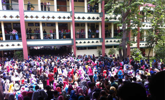 Ratusan mahasiswa UIN Syarif Hidayatullah Jakarta menyemut di depan aula Harun Nasution, Kampus 1 yang merupakan tempat dilaksanakannya kuliah umum oleh presiden Indonesia yang ke-6, Susilo Bambang Yudhoyono (Rabu, 10/12). Antusiasme mahasiswa untuk melihat langsung SBY sangat besar hingga gedung auditorium tak mampu menampung seluruh mahasiswa. Alhasil, mereka hanya mampu berkumpul di depan gedung. Haifa Inayah/RMOL
