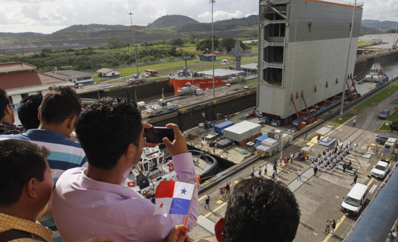 Seorang pria memotret ketika kapal tunda membantu mengangkut gerbang bergulir terakhir untuk pembangunan baru Terusan Panama melalui kunci Miraflores di Panama City pada Rabu (10/12). Reuters