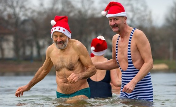 Anggota Berlin Seals berenang di Danau Orankesee yang dingin di pusat Berlin, Jerman, Rabu (25/12). Berenang di danau itu adalah salah satu tradisi masyarakat Berlin dalam menyambut Natal setiap tahun. CNN