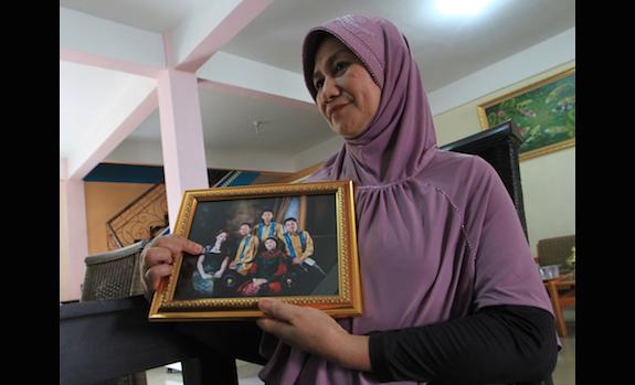 Rohana, ibu dari Khairunisa, salah seorang flight attendant AirAsia QZ8501, memperlihatkan foto anaknya di antara anggota keluarga mereka di kediaman di Palembang, Sumatera Selatan. Selain 152 penumpang, sebanyak tujuh kru ikut dalam penerbangan naas itu. Abdul Qodir/Getty Images