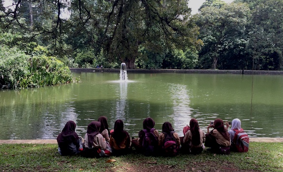 Sekelompok siswa mengenakan seragam Pramuka duduk berbaris di pinggir danau buatan di Kebun Raya Bogor (Sabtu, 10/1). Mereka menyaksikan tanaman-tanaman unik di sekitar danau yang karena bentuknya itu disebut Danau Gunting. Mulai dari rerimbunan pohon di tengah danau yang menjadi habibtat burung bangau, sampai pohon leci berdahan lima yang juga merupakan pohon tertua di Kebun Raya Bogor. Diperkirakan usia pohon leci itu 191 tahun.