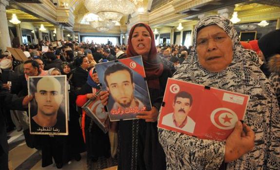 Sekelompok pengunjuk rasa menuntut hak istimewa atas nyawa anak maupun kerabatnya pada upacara peringatan tahunan revolusi Tunisia di Istana Presiden di kota utara Carthage dekat ibukota negara, Tunisia, kemarin. Pertemuan yang dihadiri oleh Presiden Tunisia Beji Caid Essebsi, dilanjutkan setelah beberapa saat terhenti atas keramaian para pengunjuk rasa tersebut.