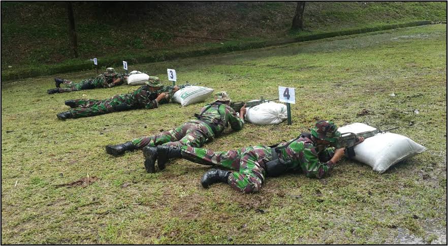 Prajurit TNI Batalyon Infanteri 433 Komando Cadangan Strategis Angkatan Darat (Kostrad) mengikuti penataran kemahiran menembak di Markas Batalyon Yonif Linud 433, Maros, Sulawesi Selatan (Senin, 2/2). Penataran dilaksanakan sejak tanggal 2 hingga 6 Februari 2015. Penkostrad TNI