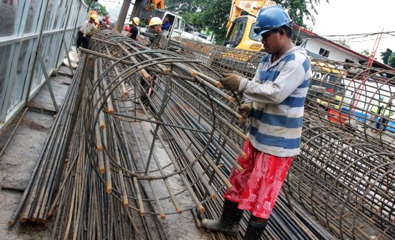Sejumlah pekerja merangkai besi beton saat mengerjakan proyek pembangunan jalan layang Simpang Tak Sebidang (STS) Permata Hijau di kawasan Patal Senayan, Jakarta. Pembangunan jalan layang ini merupakan program Pemprov DKI dalam mengatasi kemacetan dan meminimalkan potensi kecelakaan di perlintasan kereta api. Deri Ridwansah/RM
