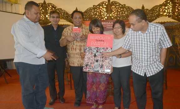 Pengamat komunikasi politik dari Universitas Paramadina, Hendri Satrio (paling kiri) bersama masing masing (kiri ke kanan) Pemimpin Redaksi The Jakarta Post Medyatama Surjodiningrat, fungsionaris Gerindra FX. Arif Puyuono, penulis buku Kristin Samah, penulis buku Fransiska Ria Susanti serta Ketua DPP Projo (Pro Jokowi) Budi Arie Setiadi seusai diskusi politik dan peluncuran buku Berpolitik Tanpa Partai di Jakarta, Kamis 12 Februari 2015. Dialog antara lain mengkritisi pemerintahan Jokowi JK atas serangkaian isu yang mendera pemerintahan pasca 100 hari. Ahmad Ali/RM