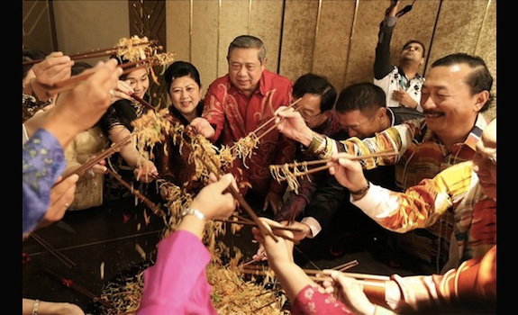 Mantan Presiden Susilo Bambang Yudhoyono dan Ibu Ani Yudhoyono mengambil Yee Sang, sejenis salad, dalam perayaan Tahun Baru Imlek bersama rekan-rekan mereka di Kuala Lumpur, Malaysia (Kamis, 19/2). Foto diambil dari halaman Instagram Ani Yudhoyono. Yee Sang merupakan simbol kemakmuran, tulis Ani Yudhoyono. Repro