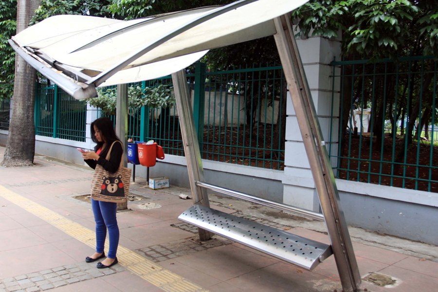 Halte bus di trotoar ruas Jalan Sudirman, Kawasan Pintu Satu Gelora Bung Karno, Jakarta, hampir rubuh (Sabtu, 7/2). Bukan saja tidak sedap dipandang, halte yang berada di jalan utama Ibukota tersebut juga mengancam keselamatan pejalan kaki. Tedy Kroen/Rakyat Merdeka