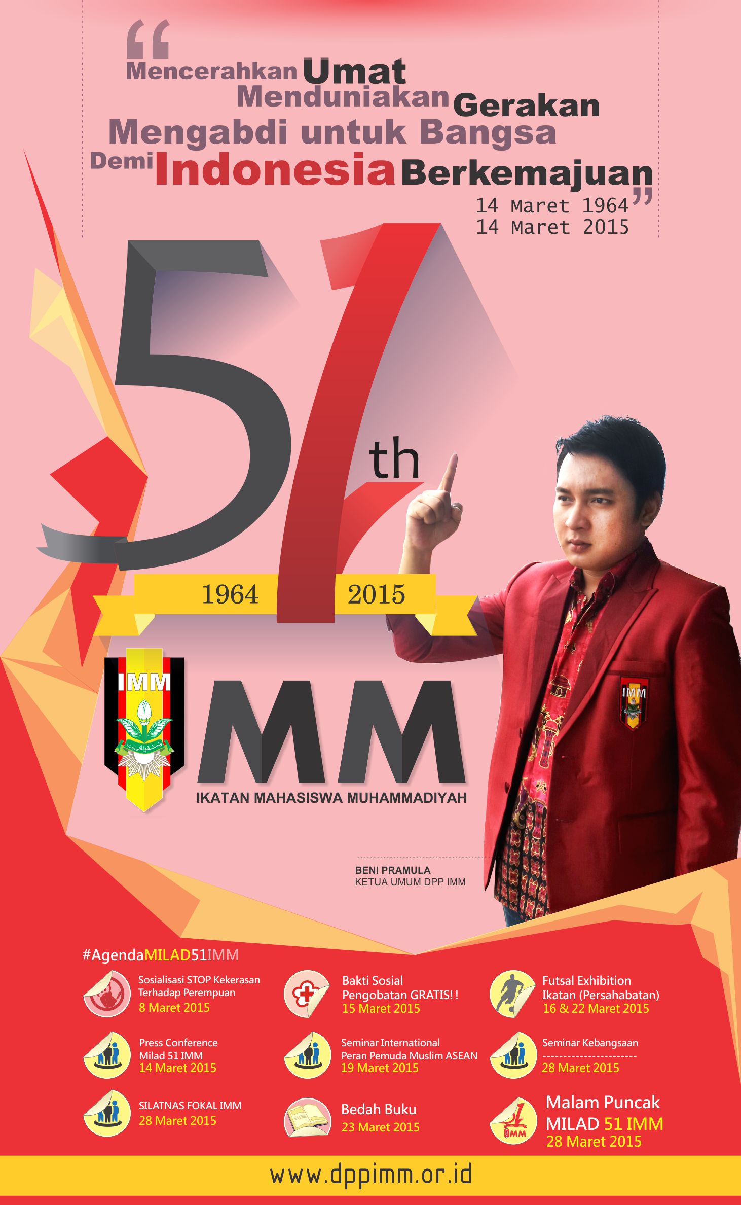 Malam puncak perayaan milad IMM ke-51 ini akan digelar pada Sabtu, 28 Maret 2015 di Gedung Dakwah PP Muhammadiyah, Jalan Menteng Raya 62, Jakarta Pusat. Acara malam puncak ini akan diisi pemutaran film dokumenter, orasi kebangsaan tokoh-tokoh nasional, pentas seni kader, pemberian penghargaan IMM, pengobatan gratis, dan pemberian beasiswa bagi kader IMM berprestasi. Untuk itu, Beni berharap agar seluruh kader dan alumni IMM turut hadir merayakan malam puncak milad IMM tersebut.