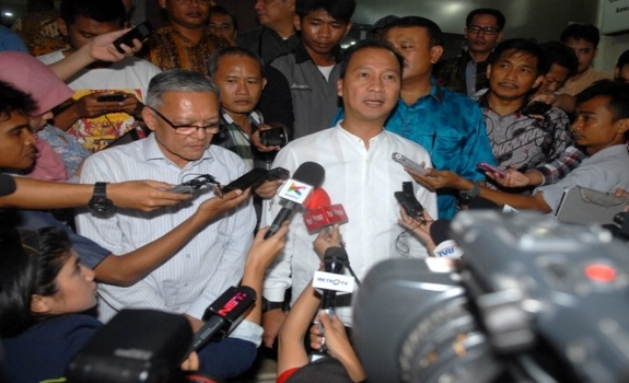 Wakil Ketua Umum Partai Golkar hasil Munas Ancol, Agus Gumiwang (kanan) dan Ketua DPP Bidang Hukum dan HAM Partai Golkar Lawrence Siburian (kiri) memberi penjelasan tentang pelaporan pimpinan Fraksi Golkar DPR RI versi Aburizal Bakrie, Ade Komaruddin (Akom) dan Bambang Soesatyo (Bamsoet) ke Bareskrim Mabes Polri, Jumat (27/3).