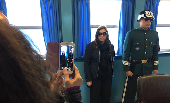 In Business dari Cyprus, Stella Mourettou, berfoto di samping tentara Korea Selatan yang bersiap siaga di dalam salah satu bangunan yang menghubungkan Korea Selatan dengan Korea Utara di Joint Security Area (JSA) Panmunjom. JSA merupakan satu-satu tempat di dalam Zona Demiliterisasi Korea dimana Korea Selatan berhadap-hadapan langsung dengan Korea Utara tanpa pagar pembatas. Hingga kini kedua Korea masih dalam situasi perang. Perjanjuan gencatan senjata di tandatangani pada Juli 1953, dan perang bisa kembali pecah sewaktu-waktu.