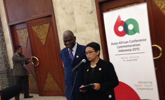 Menteri luar negeri Indonesia, Retno Marsudi dan Menlu Burkina Faso, Djibrill Yipene Bassole melakukan konfrensi pers setelah sebelumnya menggelar pertemuan bilateral tertutup dalam acara peringatan KAa di JCC, Senayan, hari ini (Selasa, 21/4). Dalam kesempatan itu Yippene menyebut, pertemuan dilakukan untuk menguatkan hubungan kerjasama antara kedua negara. Pernyataannya tersebut dimini oleh Menlu Retno. Haifa Inayah/RMOL