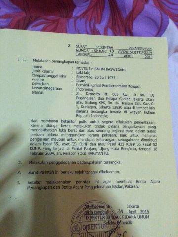 Surat perintah penangkapan ternyata sudah dikeluarkan pekan lalu. Hal itu terlihat dari tanggal surat perintah penangkapan Novel tertanggal 24 April 2015, atau dua hari setelah pelantika Komjen Budi Gunawan sebagai Wakapolri. Penahanan Novel dilakukan atas Surat Perintah Nomori: SP.Kap/19/IV/2015/Dittipidum.