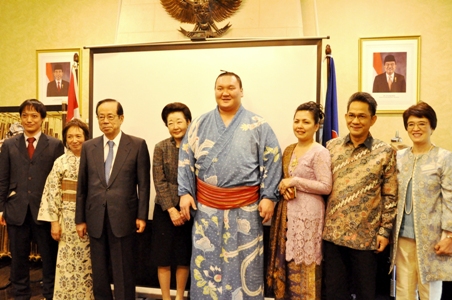 Pemegang gelar juara sumo selama delapan tahun berturut-turut ini tersenyum lebar saat berfoto bersama Dubes Indonesia untuk Jepang, Yusron Ihza Mahendra di sela acara. Selain Hakuho, promosi ini juga dihadiri oleh berbagai kalangan, sejak dari wakil pemerintah, para dubes negara sahabat, pengusaha, akademisi, serta petinggi Asosiasi Kimono Jepang.