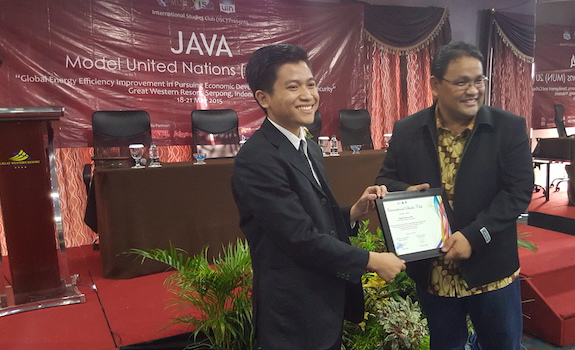 Pemimpin Umum Kantor Berita Politik RMOL Teguh Santosa (kanan) menerima plakat penghargaan dari Ketua Panitia Java Model United Nations (Java MUN) Ichsan Fadhillah dalam pembukaan Java Mun di Great Western Hotel, Serpong, Banten (Senin, 18/5). Simulasi teknik persidangan PBB ini diselenggarakan oleh Iternational Studies Club (ISC) Universitas Islam Negeri Syarif Hidayatullah, Jakata, dan diikuti puluhan mahasiswa dari sejumlah kampus di Indonesia. Selain dari Indonesia, peserta juga berasal dari bangladesh.