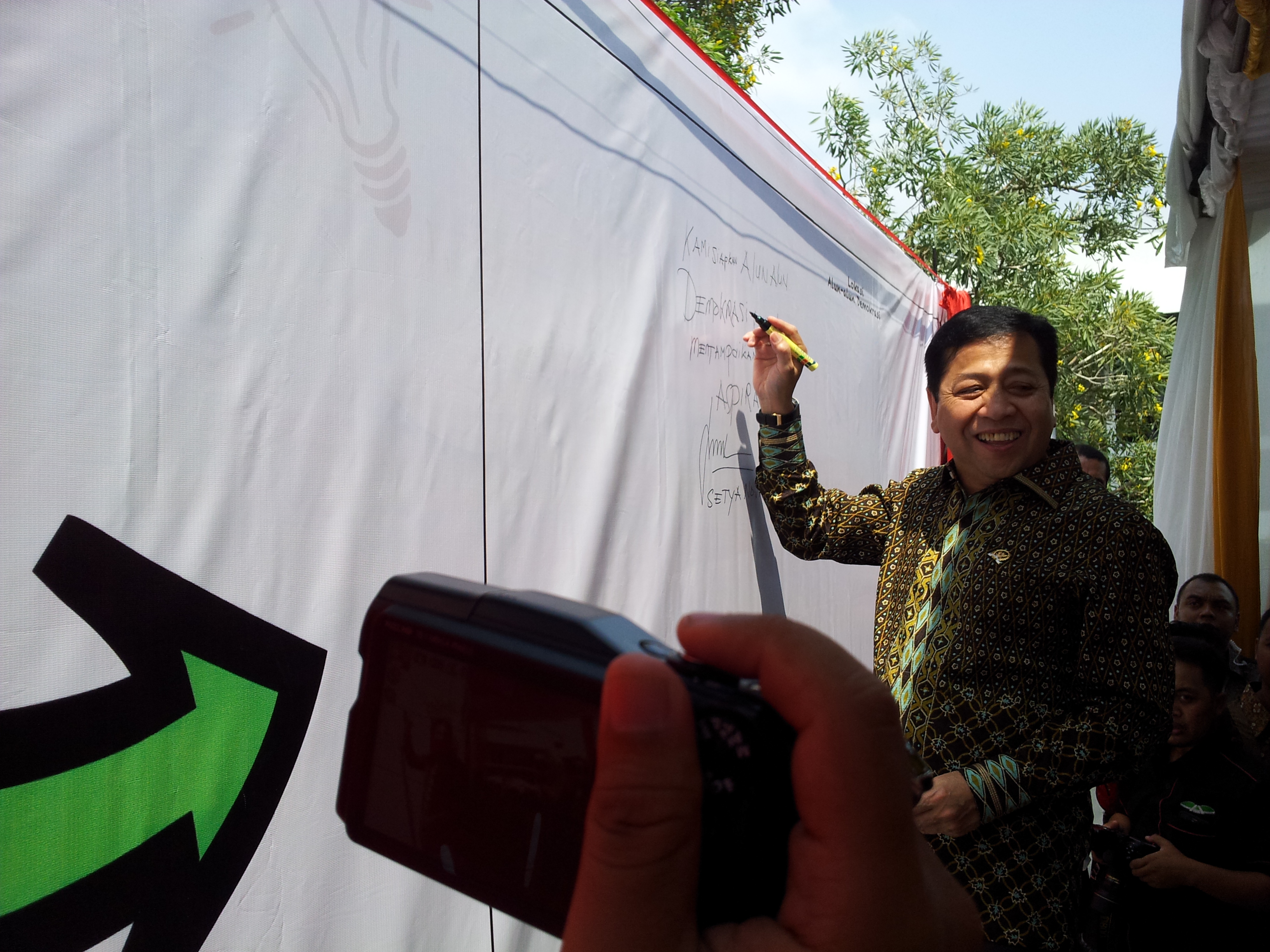 Ketua DPR RI Setya Novanto menulis memo di acara peresmian Alun-alun Demokrasi di gedung DPR, Senayan, Jakarta (Kamis, 21/5). Memo Setya itu bertuliskan "Kami Siapkan Alun Alun Demokrasi untuk Menyampaikan Rakyat Aspirasi" dan dibubuhi tanda tangan Setnov. Widian Vebriyanto/RMOL