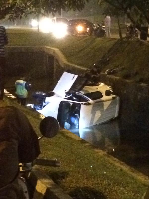 "Kecelakaan kendaraan masuk ke Kali di depan McD Emerald Bintaro dan masih penanganan Polri," kicau akun itu.
