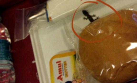 Foto ini diambil oleh seorang penumpang dalam penerbangan Air India dari Delhi menuju London pada Kamis (11/6). Penumpang tersebut mengklaim bahwa dirinya menemukan cicak dalam katering makanannya. Foto tersebut menyebar di sosial media. Namun pihak Air India membantah tuduhan tersebut dan mengaku tidak pernah menerima laporan resmi terkait hal tersebut. Daily Mail