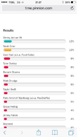 Seperti sudah diduga, pendiri Lingkaran Survei Indonesia (LSI) Denny JA akhirnya berada di urutan pertama dalam daftar orang paling berpengaruh di dunia maya versi Majalah Time. Dengan meraih poling sebesar 12 persen, Denny JA berhasil mengangkangi Nash Grier yang sama-sama memiliki poin 12 persen dan Vani Hari alias Food Babe yang tergeser ke urutan ketiga dengan 10 persen.