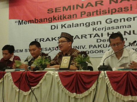 Hal tersebut diungkapkan anggota MPR RI Fraksi Hanura Capt. H. Djoni Rolindrawan, dalam gelar acara Seminar Nasional Fraksi Hanura MPR RI bekerjasama dengan BEM STIE Kesatuan, BEM Universitas Pakuan dan Mahasiswa Se-kota Bogor, di Ballroom Hotel Sahira, Bogor, Minggu ( 5/7 ).