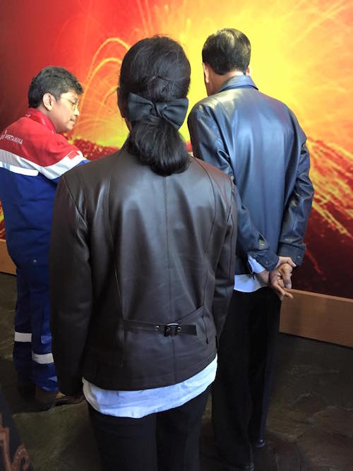 Kompakan berjaket kulit, Presiden dan Menteri Rini masuk ke areal Geothermal Information Centre. Di lokasi ini, rombongan diberi penjelasan mengenai proses pengambilan energi panas bumi dan melihat maket pengembangan PLTP di Kamojang.