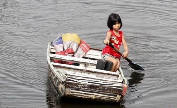 Seorang anak perempuan mendayung perahu darurat di Malabon, Metro Manila Filipina akhir pekan lalu. Manila dan sejumlah kota di Filipina diketahui digenangi banjir sejak pekan lalu akibat hujan lebat yang turun terus menerus. Banjir pun menyebabkan setidaknya delapan orang tewas. Reuters