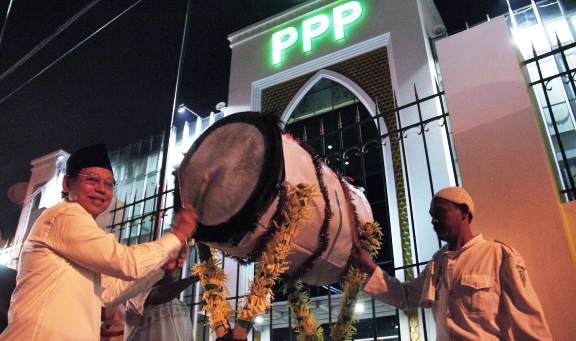 Ketua Umum PPP Djan Faridz memukul bedug saat merayakan takbiran di kantor DPP PPP, Jakarta, Kamis (16/7) malam. Kegiatan tersebut sekaligus melepaspawai gema takbir dan tahmid PPP menyambut satu syawal 1436 H. Indra Hardi/RM