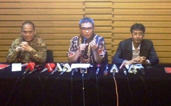 Pimpinan sementara Komisi Pemberantasan Korupsi, Johan Budi SP (tengah) mengumumkan penetapan status tersangka Gubernur Sumatera Utara Gatot Pujo Nugroho dan istri keduanya Evy Susanti di gedung KPK, Jakarta, Rabu (29/7). Penjelasan Johan membenarkan isu Gatot dan istri berstatus tersangka suap hakim PTUN Medan yang beredar sejak kemarin malam.Feby Yana/RMOL