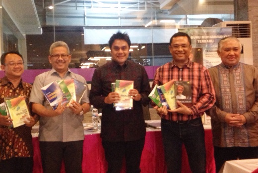 Menteri Perindustrian Saleh Husin (kedua dari kanan) berfoto bersama Ketua Umum PP Muhammadiyah Din Syamsuddin (kanan) dan (kiri ke kanan) Sekretaris PP Muhammadiyah Abdul Mu'thi, Direktur CSIS Rizal Sukma serta musisi Dwiki Dharmawan di Restoran Pualam, Jalan Mochtar Lutfi, Makassar, Minggu malam (2/8).