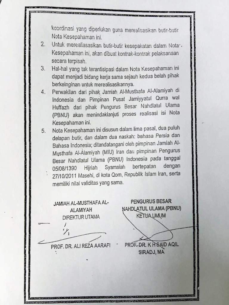 Parahnya, dokumen kerjasama di bidang pendidikan, riset dan kebudayaan itu dilakukan tanpa sepengetahuan dan persetujuan Rais Am Syuriah PBNU yang saat itu dijabat KHA Sahal Mahfudz. Dokumen tertanggal 27 Oktober 2011 itu dibuat dalam dua bahasa, Persia dan Indonesia.