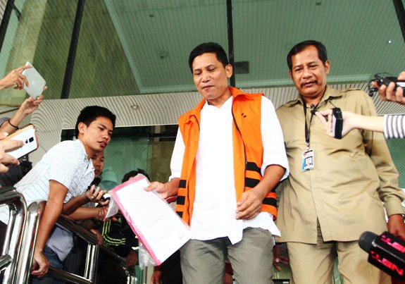 Ketua Fraksi PDIP DPRD Kabupaten Musi Banyu Asin (Muba) Bambang Karyanto menenteng dokumen usai menjalani pemeriksaan lanjutan di gedung KPK, Jakarta, Kamis (13/8). Dia diperiksa sebagai tersangka dalam kasus dugaan menerima suap sebesar Rp 2,56 miliar terkait pembahasan Anggaran Pendapatan dan Belanja Daerah Perubahan (APBD-P) Pemerintah Daerah Muba tahun anggaran 2015. Tedy Kroen/RM