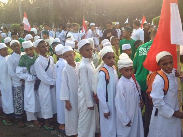 Santri-santri asli Papua ikut semarakkan Parade Tauhid Indonesia di Gelora Bung Karno, Jakarta (Minggu, 16/8). Ribuan umat Islam dari berbagai ormas Islam melakukan parade pagi tadi dari Gelora hingga Bundaran HI. Parade Tauhid ini adalah bagian dari menyemarakkan HUR ke-70 Kemerdekaan RI. Repro