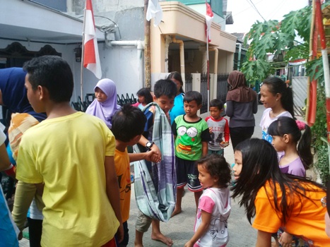 Pada Peringatan HUT Kemerdekaan Republik Indonesia ke-70, anak-anak di RT 06/RT 07, Kelurahan Bakti Jaya, Kecamatan Sukmajaya, Kota Depok, Jawa Barat menggelar serangkaian perlombaan, salah satunya estafet sarung, Minggu (16/8). Dalam perlombaan ini, anak-anak bergandengan tangan, anak pertama diselempangi sarung, kemudian anak sebelahnya berusaha memindahkan tersebut kepadanya, begitu seterusnya. Jika sarung menyentuh tanah dinyatakan kalah. Hendry Ginting/RMOL