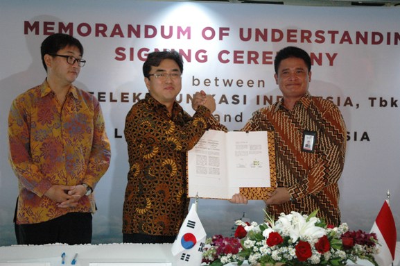 Direktur Consumer Service Telkom Dian Rachmawan (kanan), CEO Lotte Members Gang Seung Ha (tengah), bertukar naskah kerjasama yang telah ditandatangani, disaksikan Direktur Lotte Member Indonesia Shin Hyun Ik, di Jakarta, kemarin (Rabu, 23/9). PT Telekomunikasi Indonesia Tbk (Telkom) menjalin kerjasama dengan perusahaan global asal Korea, Lotte Members, dalam bidang Retail Marketing, Payment Business, Advertising Business, Call Center, Data Connection dan Data Center untuk kebutuhan pelanggan pasar online maupun offline. Randy Tri Kurniawan/RM