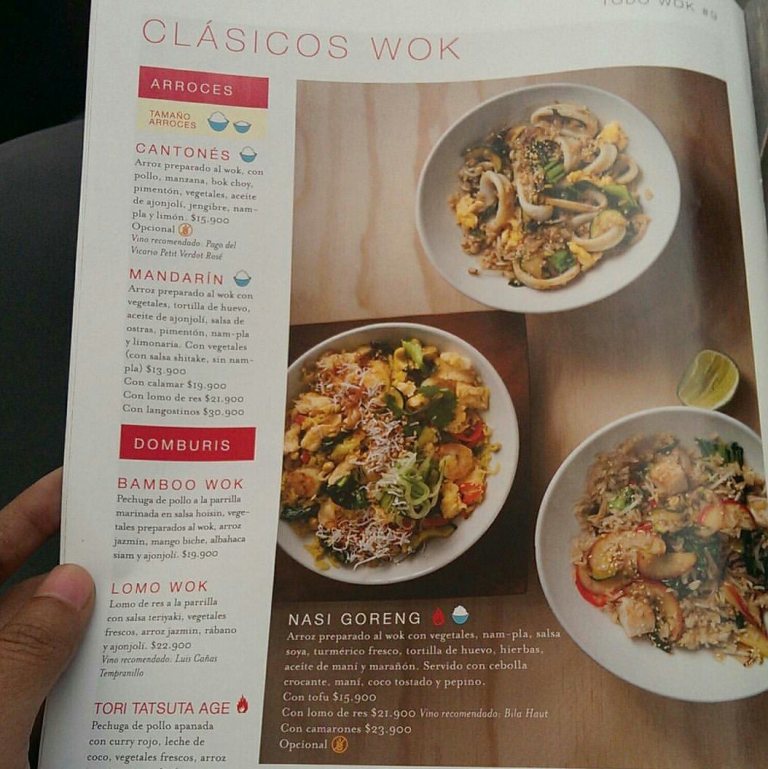 Ada tiga pilihan menu campuran nasi goreng, yakni tahu, daging sapi, serta udang. Harganya pun beragam, yang termurah adalah nasi goreng dengan campuran tahu seharga 15.900 peso kolombia atau setara dengan 73.935 rupiah (1 peso Kolombia= 4,6 rupiah). Sedangkan nasi goreng dengan daging sapi seharga 21.900 peso Kolombia dan nas goreng dangan campuran udang seharga 23.900 peso Kolombia.