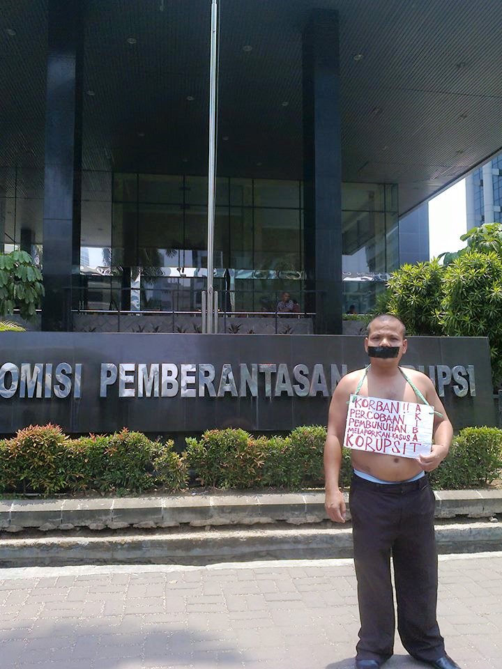 Dalam aksinya, pria yang bernama Pahruddin Hasibuan ini melakukan aksi tutup mulut sambil bertelanjang dada. Sementara di dadanya terpampang secarik kertas bertuliskan: "Korban percobaan pembunuhan pembunuhan akibat melaporkan kasus korupsi".