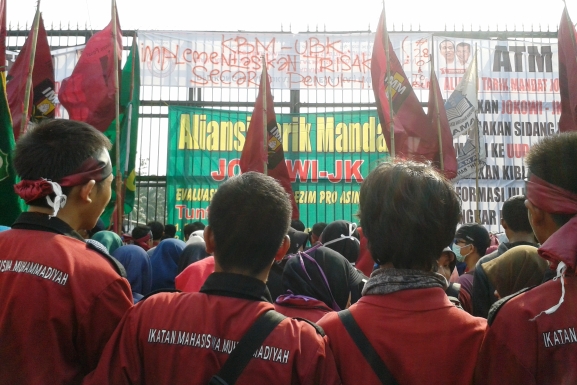 Aksi ribuan massa Aliansi Tarik Mandat (ATM) Jokowi-JK di gedung DPR, Senayan, Jakarta, Rabu (28/10) berakhir bentrok dengan aparat kepolisian. Polisi menembak dan mengejar para demonstran hingga membubarkan diri dari area demonstrasi.